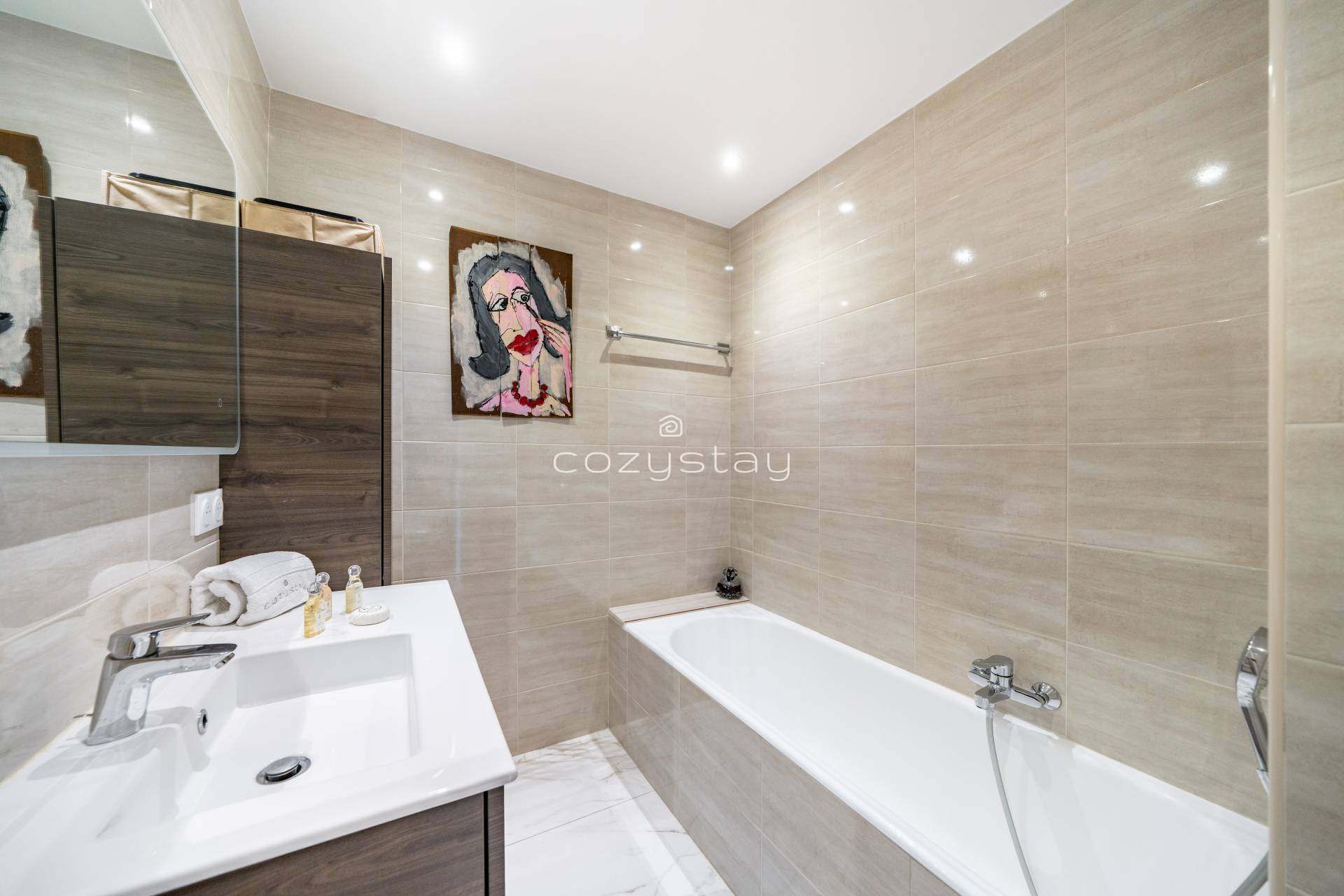 La belle chambre, à l’ambiance apaisante, offre un espace de repos agréable, tandis que la salle de bain dispose d’une baignoire parfaite pour se détendre.