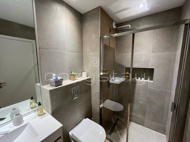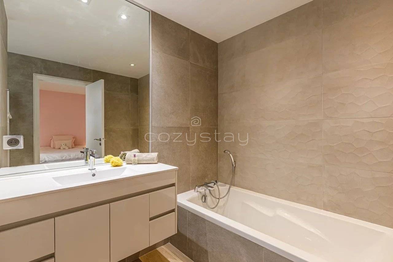 It consists of an entrance, a large living room, a fully equipped kitchen, and a spacious dining room, extended by a nice sitting area. Its three generous bedrooms, each with their private terrace, and three bathrooms can accommodate up to six guests, offering privacy and comfort to each of them.