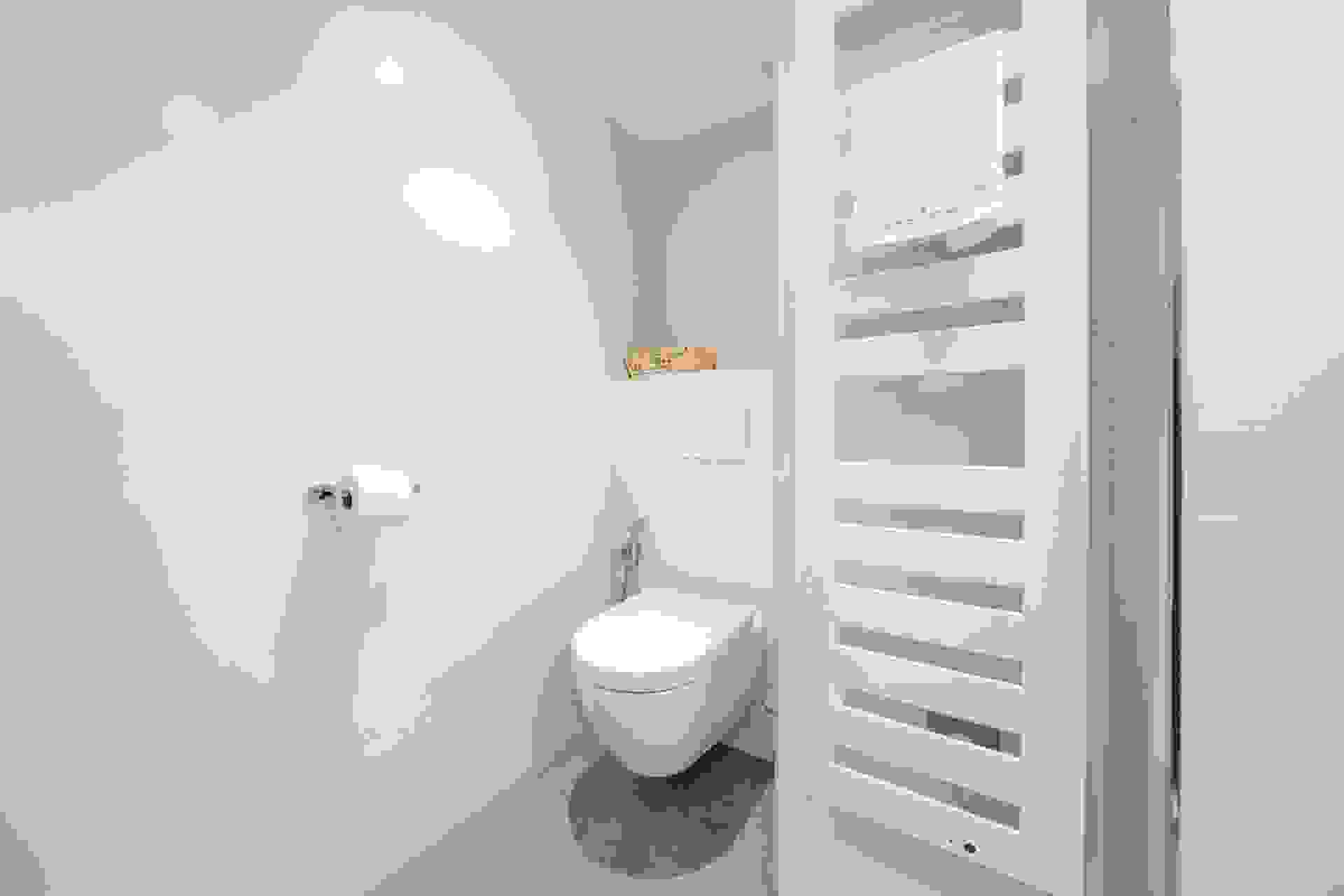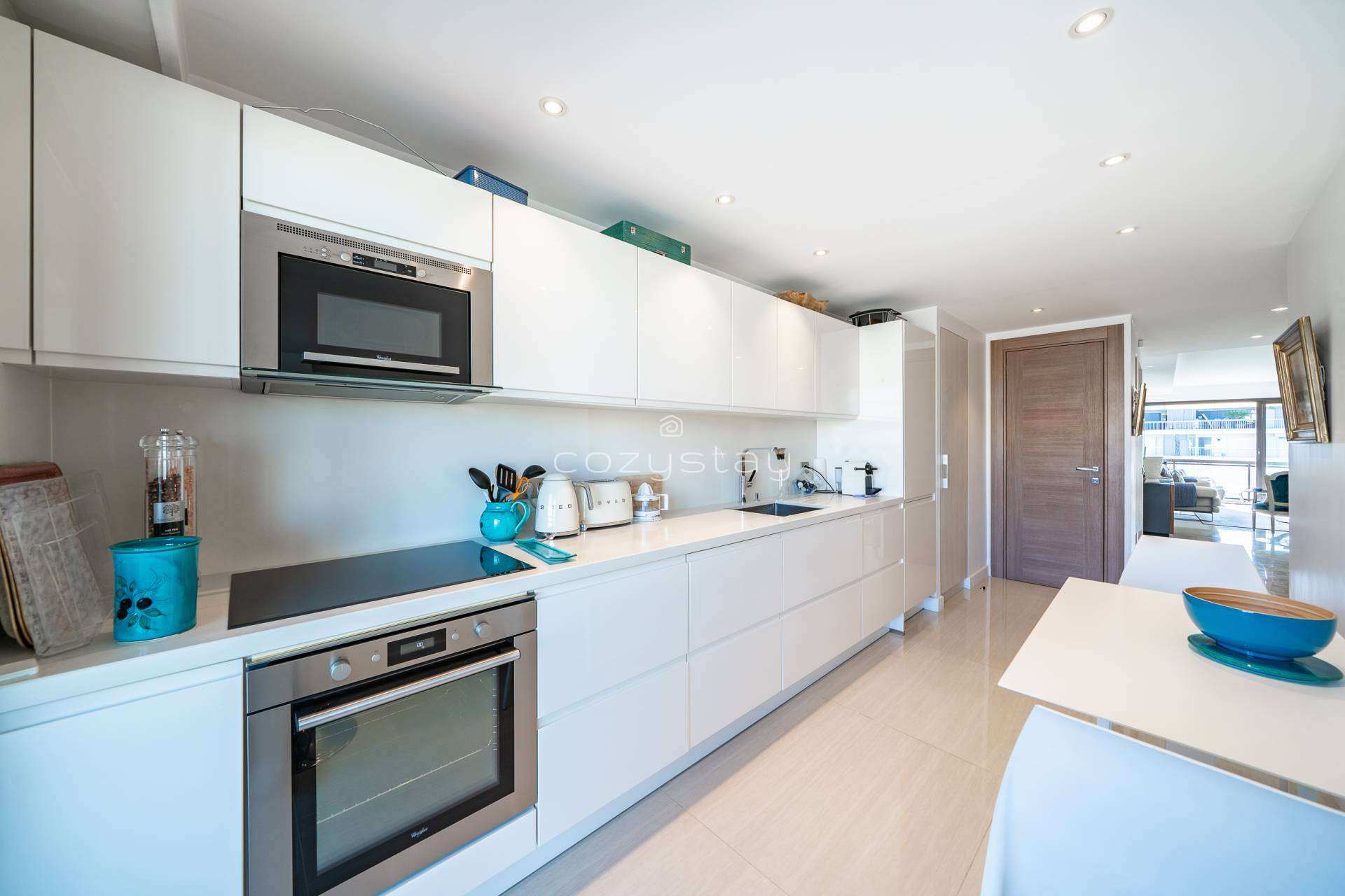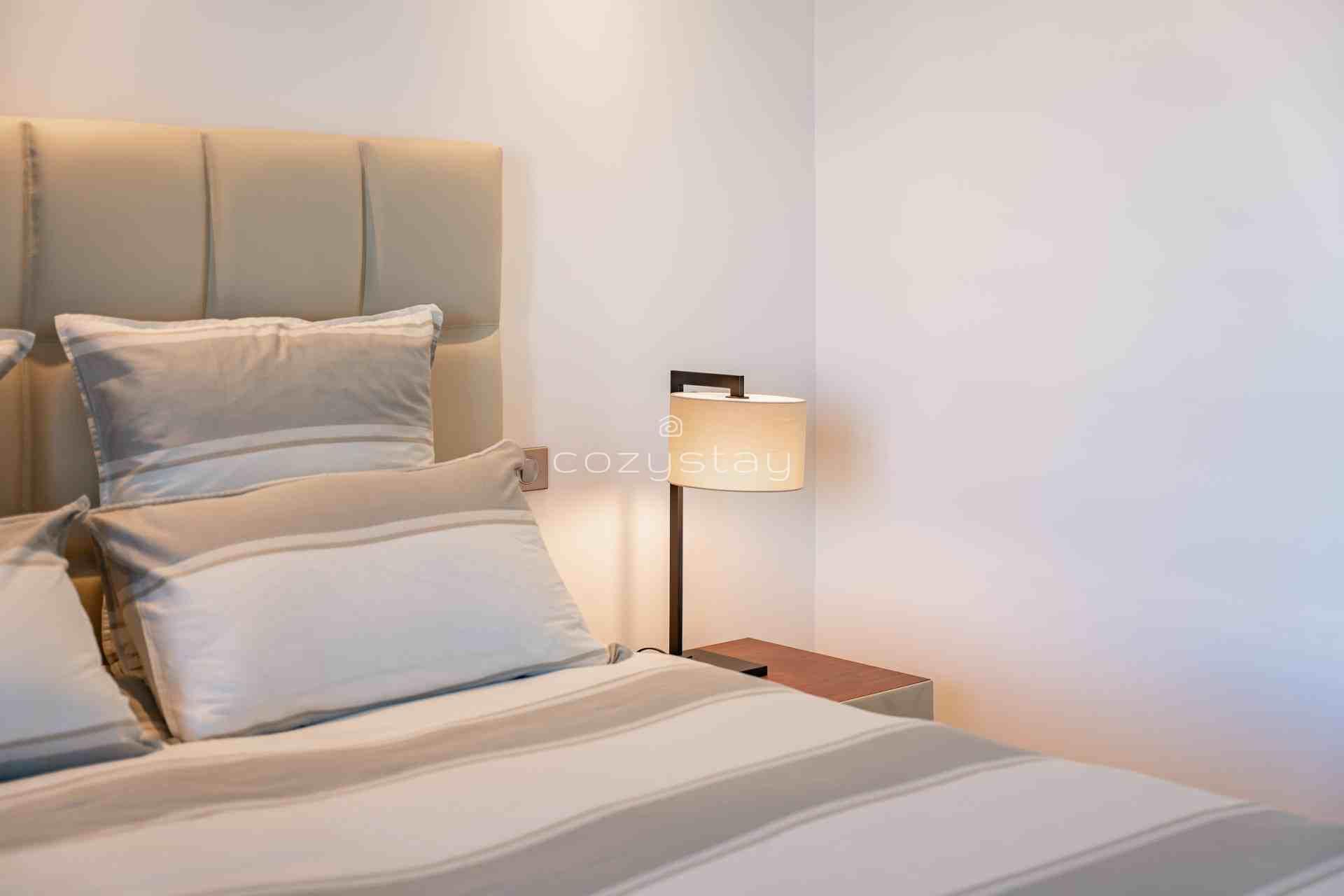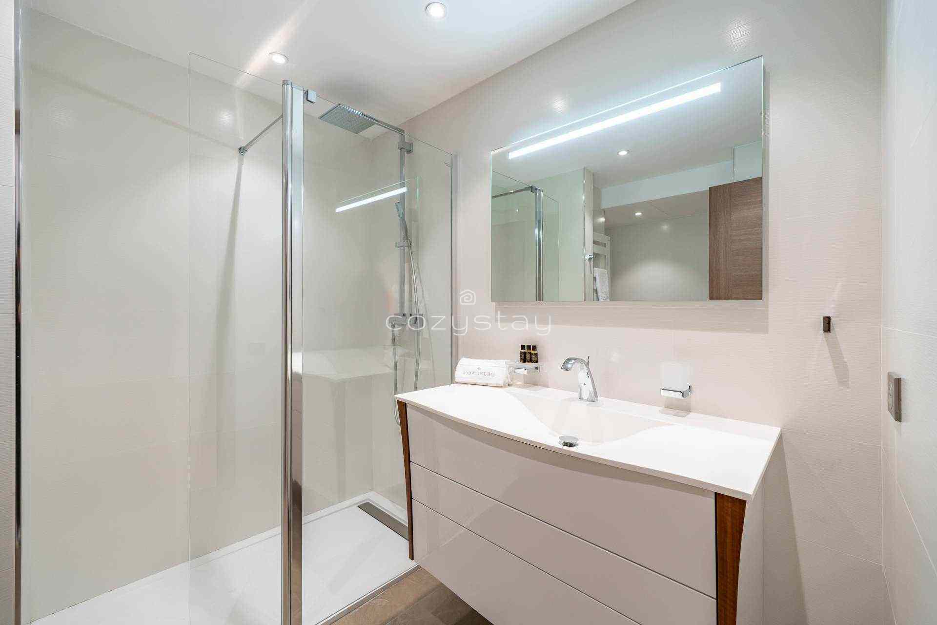 The apartment features two en-suite bedrooms, each with its own modern shower room. The bedding is of excellent quality, storage space is optimized, and finishes are designed for maximum comfort. One suite includes private toilets, and a separate guest WC adds extra convenience.