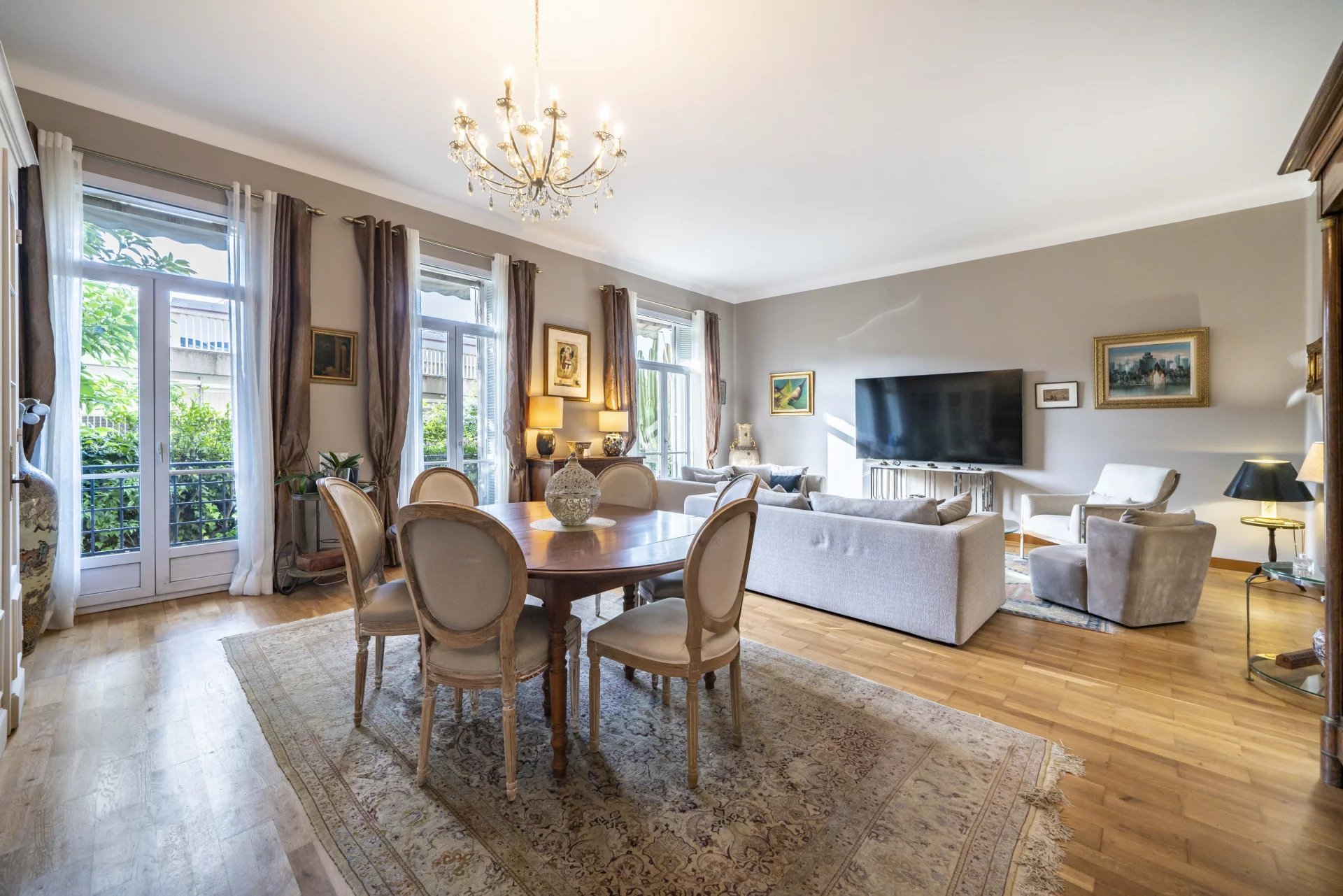 Dès l’entrée le cachet de l’appartement se révèle : vaste hall d’entrée sublimé par les carreaux de ciment d’origine, doubles portes dévoilant un séjour salle à manger d’une superficie de 46 m², belles hauteurs sous plafond et volumes généreux, parquet, grandes ouvertures pour profiter de la lumière naturelle au sud… tout le charme d’un bien de caractère au sein d’un immeuble très bien entretenu.