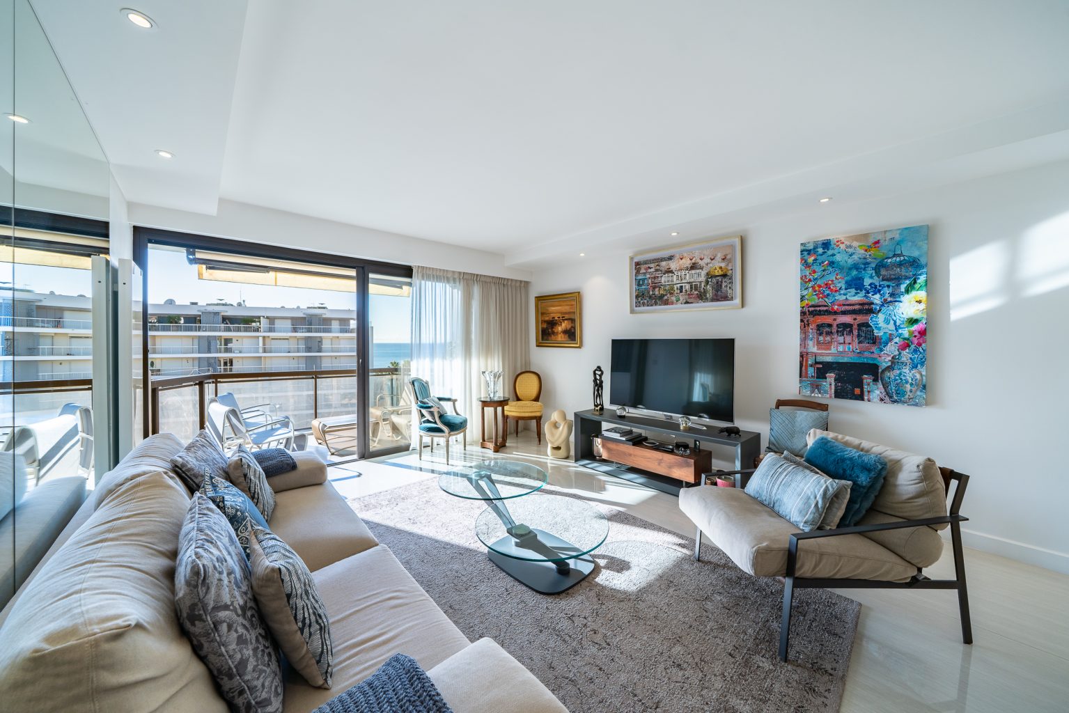L’appartement se compose d’un grand salon lumineux, ouvrant sur une terrasse avec une vue imprenable sur la mer et le Carlton, idéal pour profiter pleinement du cadre exceptionnel.