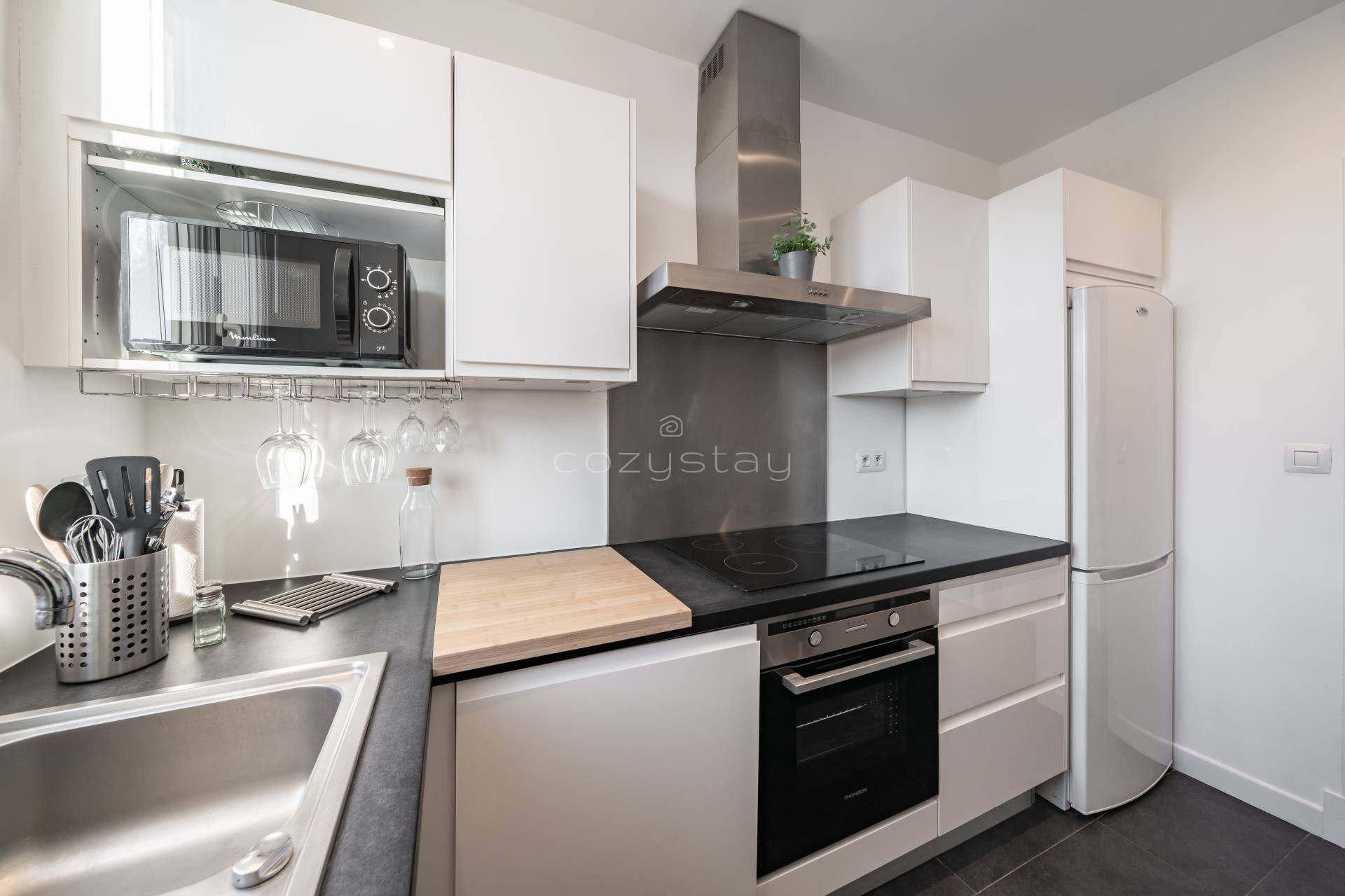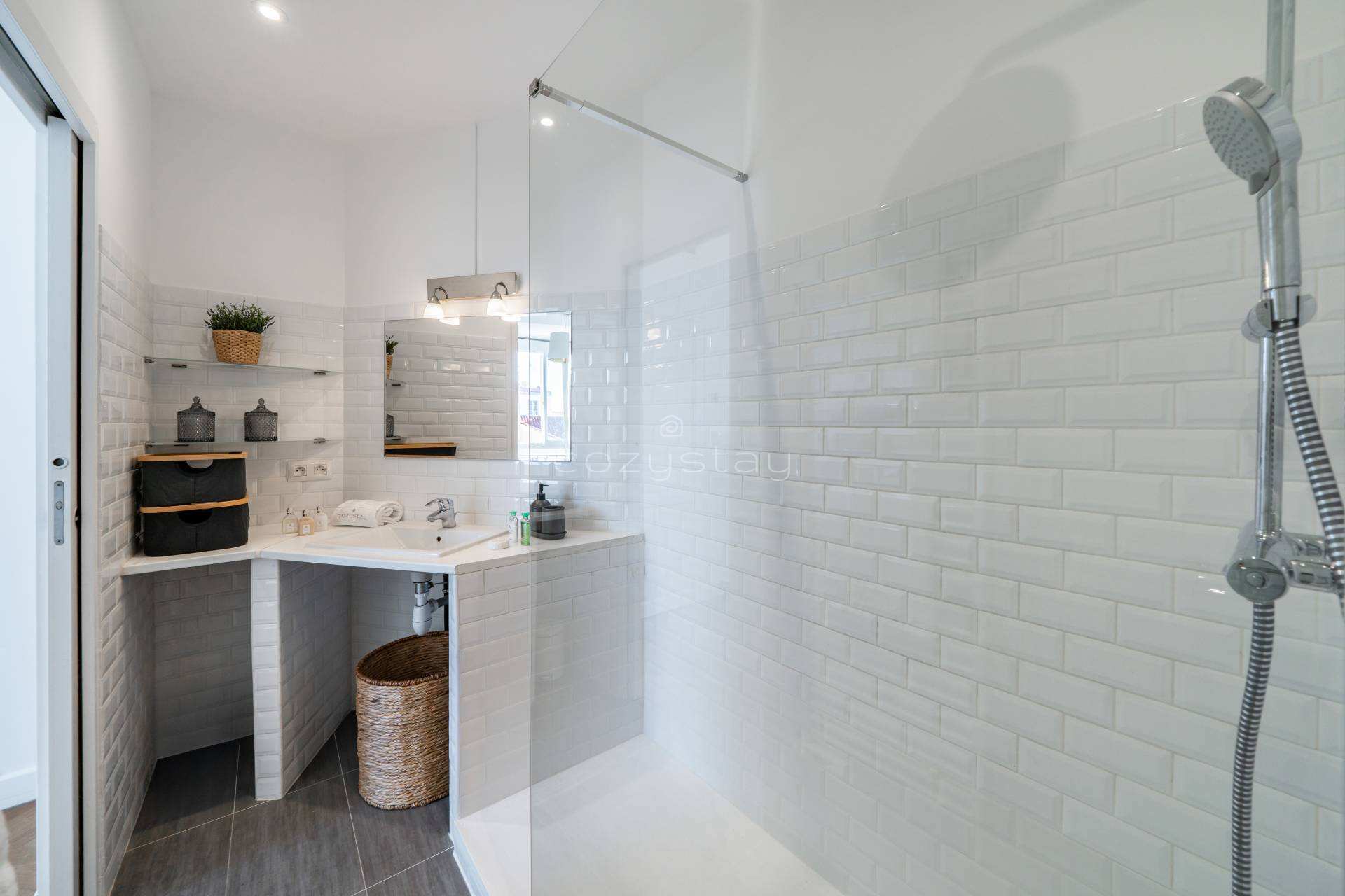 L’appartement se compose d’un grand salon-séjour lumineux avec une cuisine américaine entièrement équipée, idéale pour partager des moments conviviaux. La chambre, calme et confortable, invite au repos après une journée bien remplie. La salle de douche, moderne et fonctionnelle, complète parfaitement l’espace.