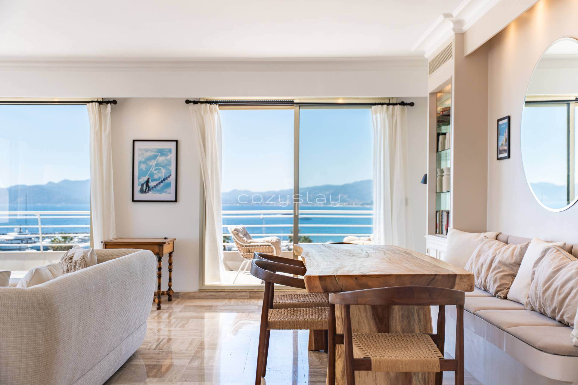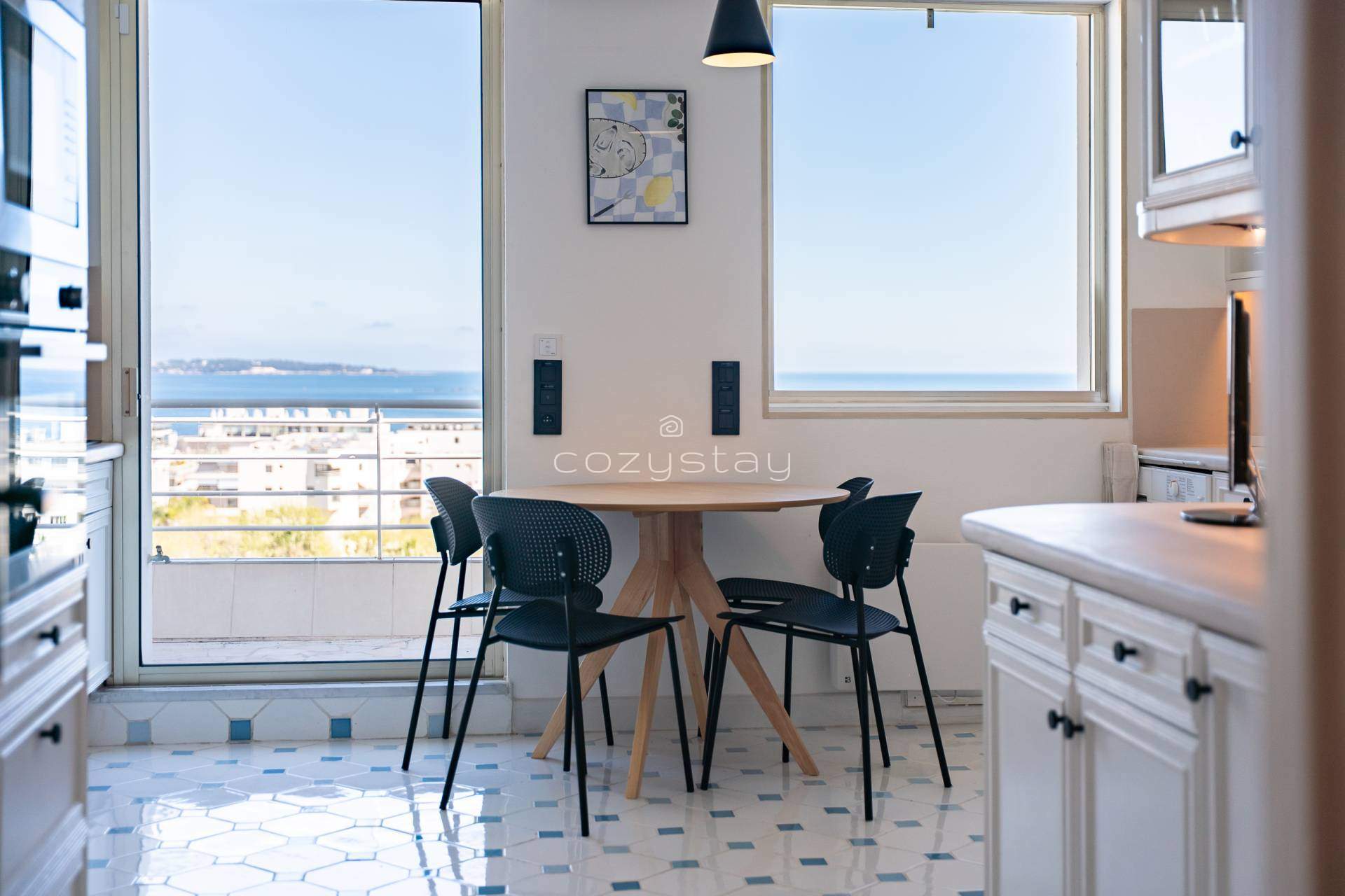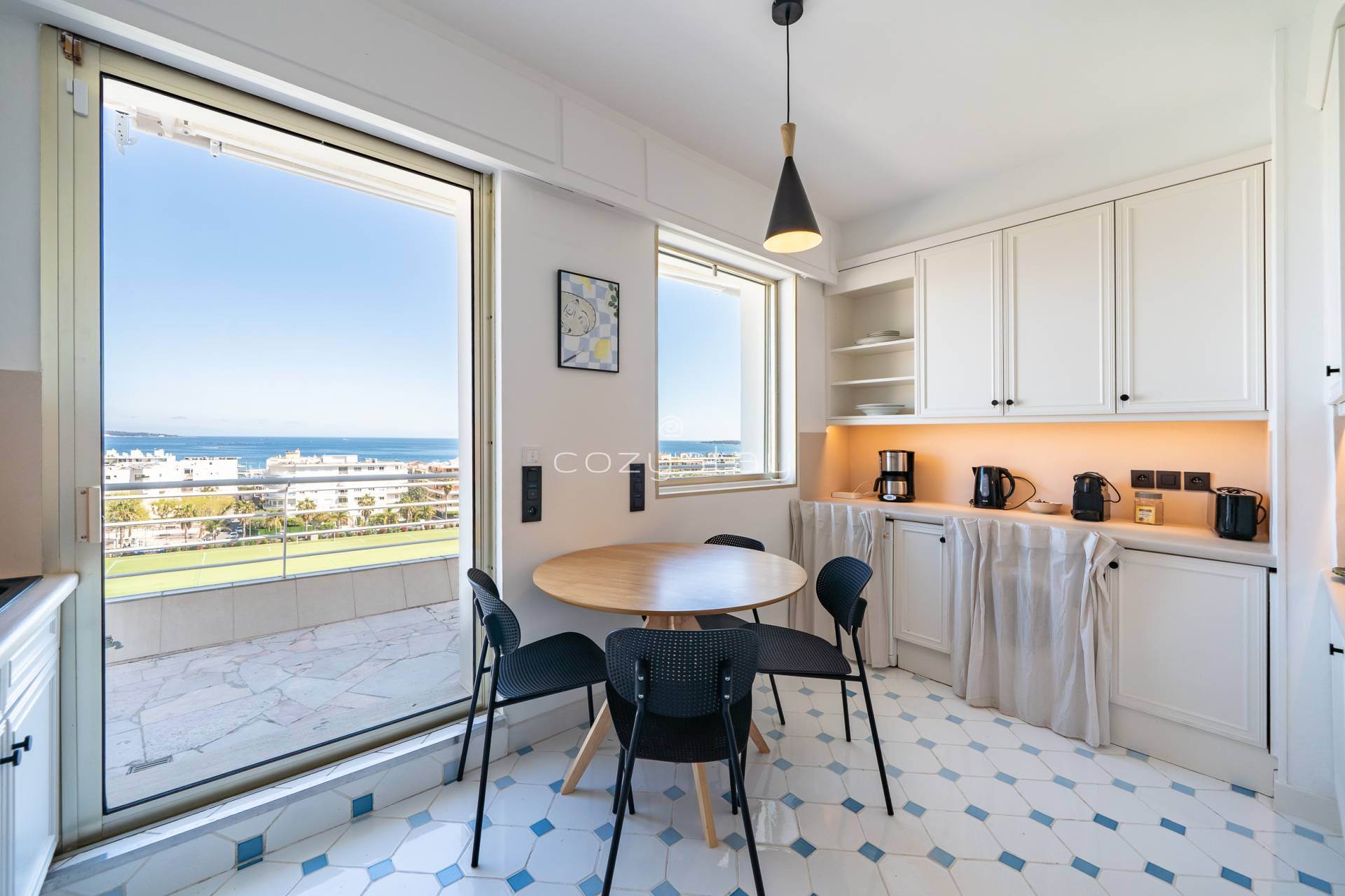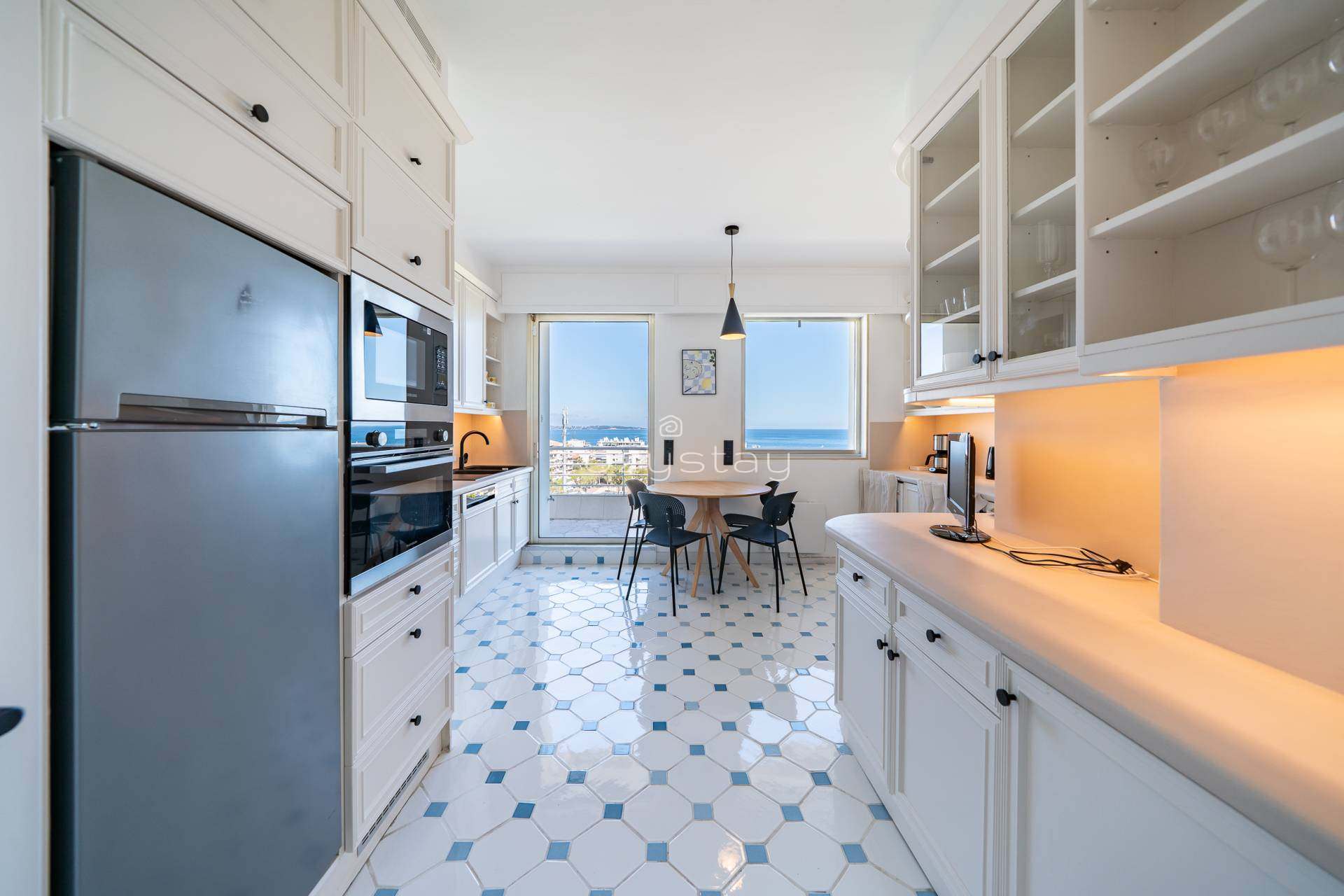 L’intérieur de l’appartement est élégant et moderne. La pièce maîtresse est un séjour lumineux avec de grandes baies vitrées qui offrent une vue panoramique imprenable sur la mer Méditerranée et les îles de Lérins. L’espace est spacieux, accueillant et idéal pour se détendre ou recevoir des invités. La cuisine, moderne et entièrement rénovée, est ouverte sur le séjour, créant un espace de vie harmonieux et convivial.