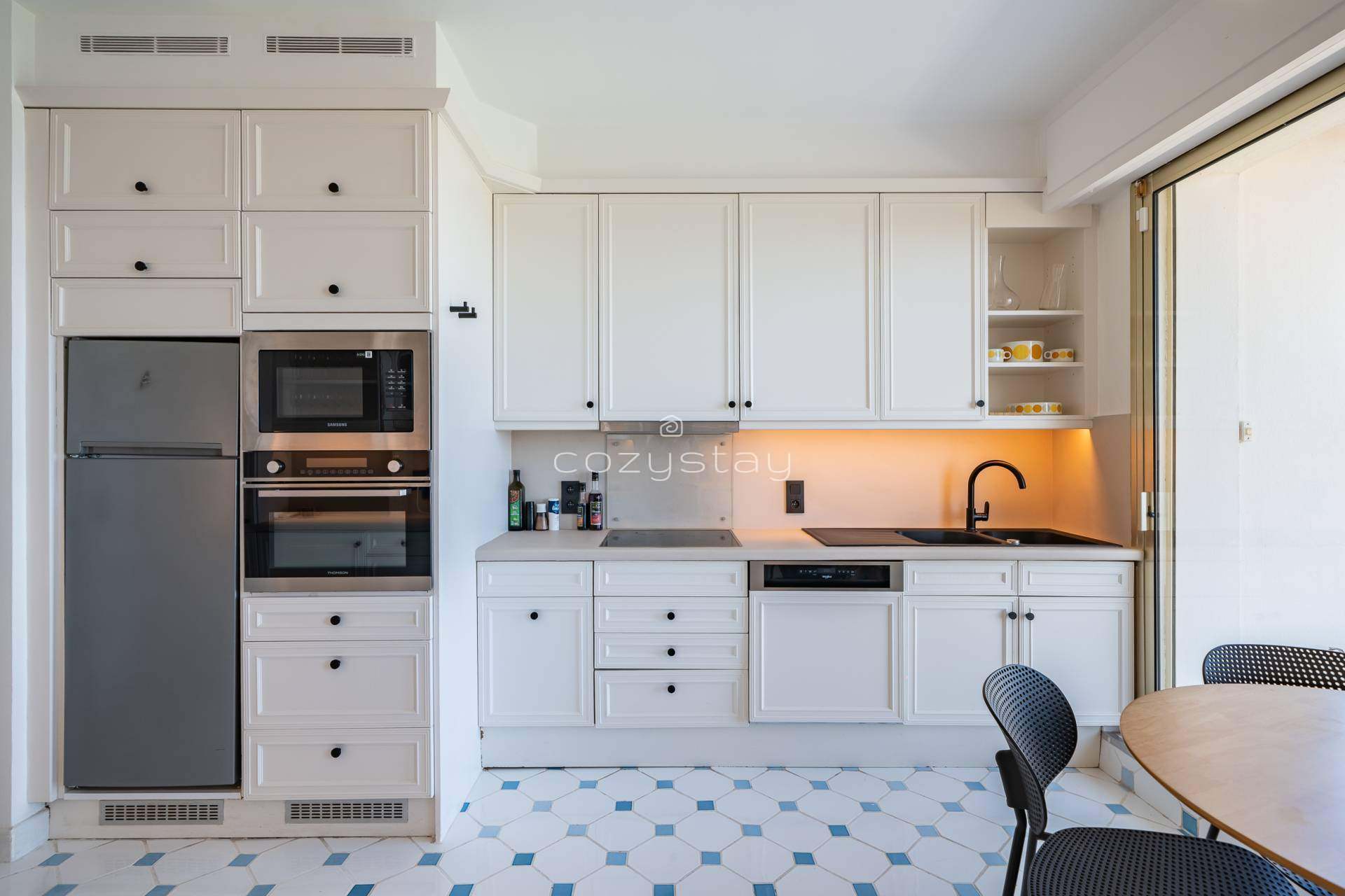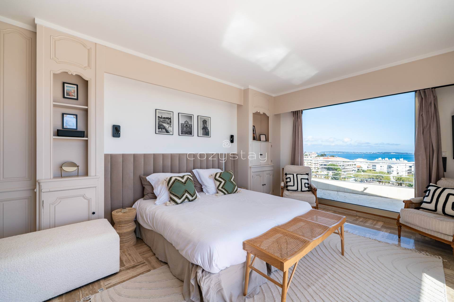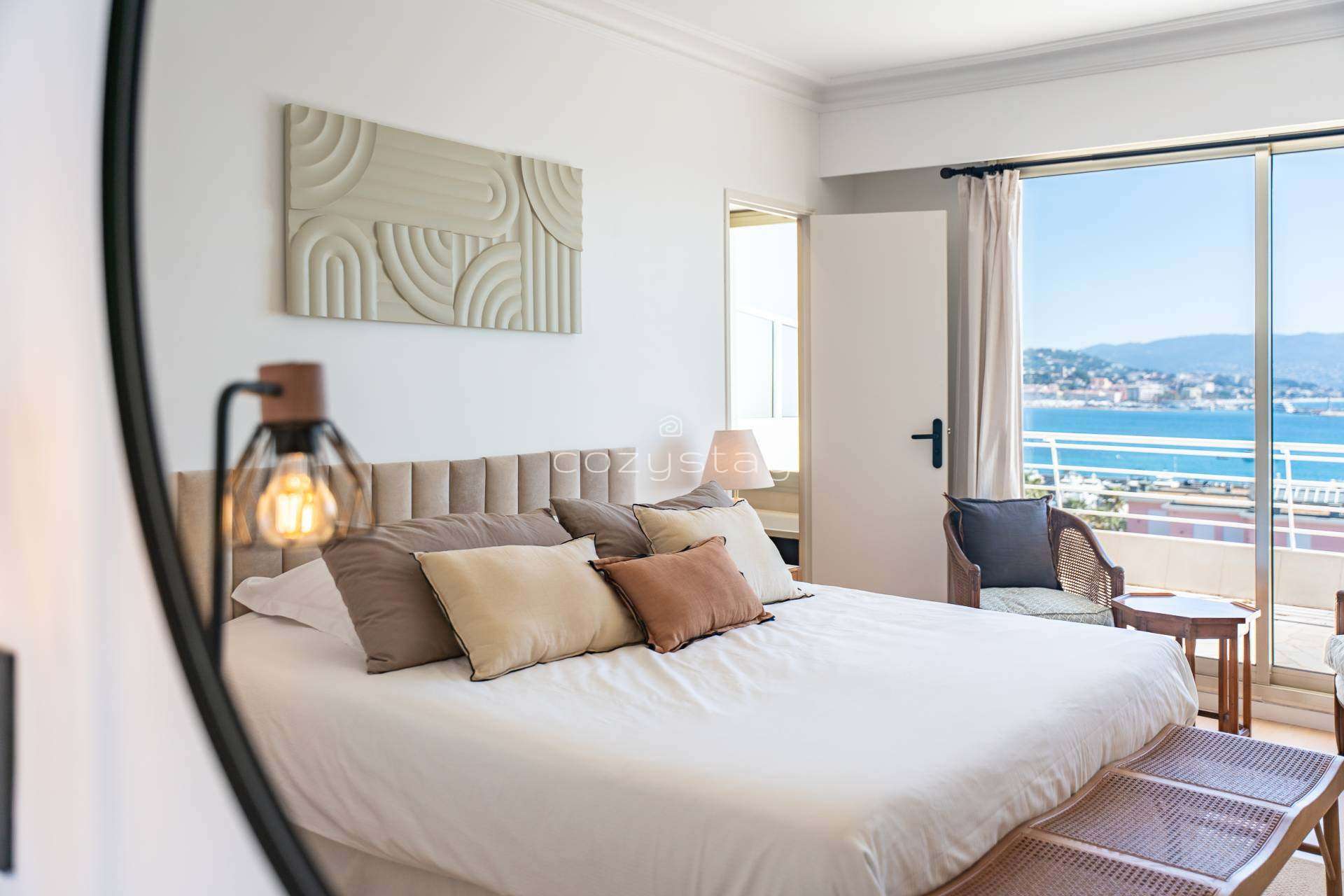 L’intérieur de l’appartement est élégant et moderne. La pièce maîtresse est un séjour lumineux avec de grandes baies vitrées qui offrent une vue panoramique imprenable sur la mer Méditerranée et les îles de Lérins. L’espace est spacieux, accueillant et idéal pour se détendre ou recevoir des invités. La cuisine, moderne et entièrement rénovée, est ouverte sur le séjour, créant un espace de vie harmonieux et convivial.