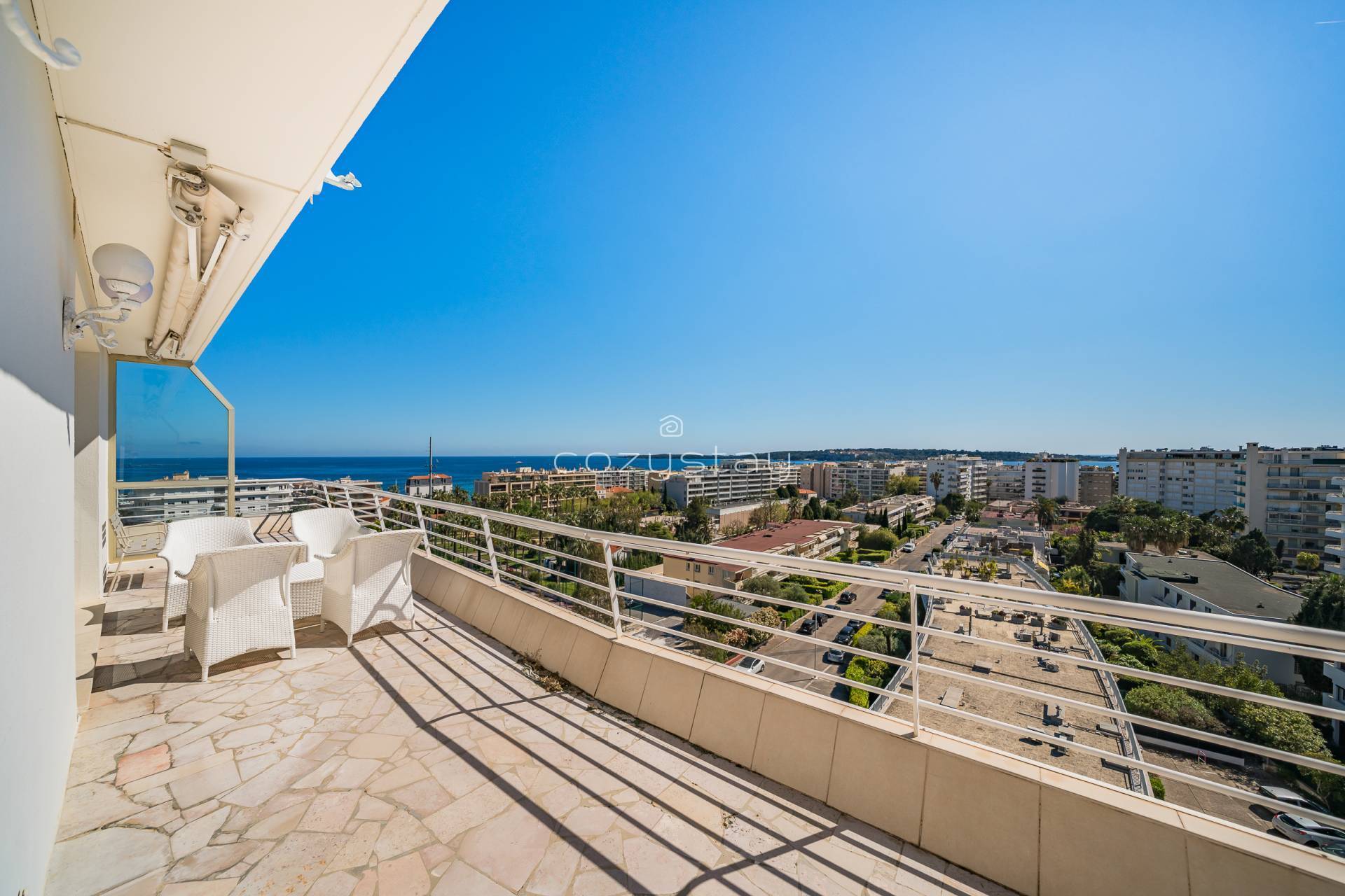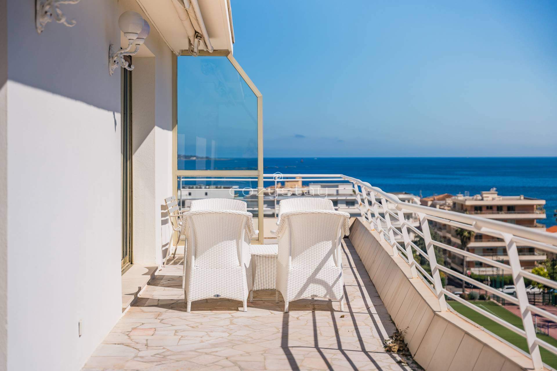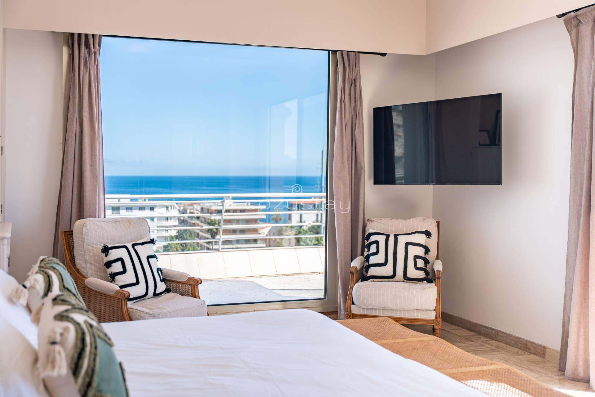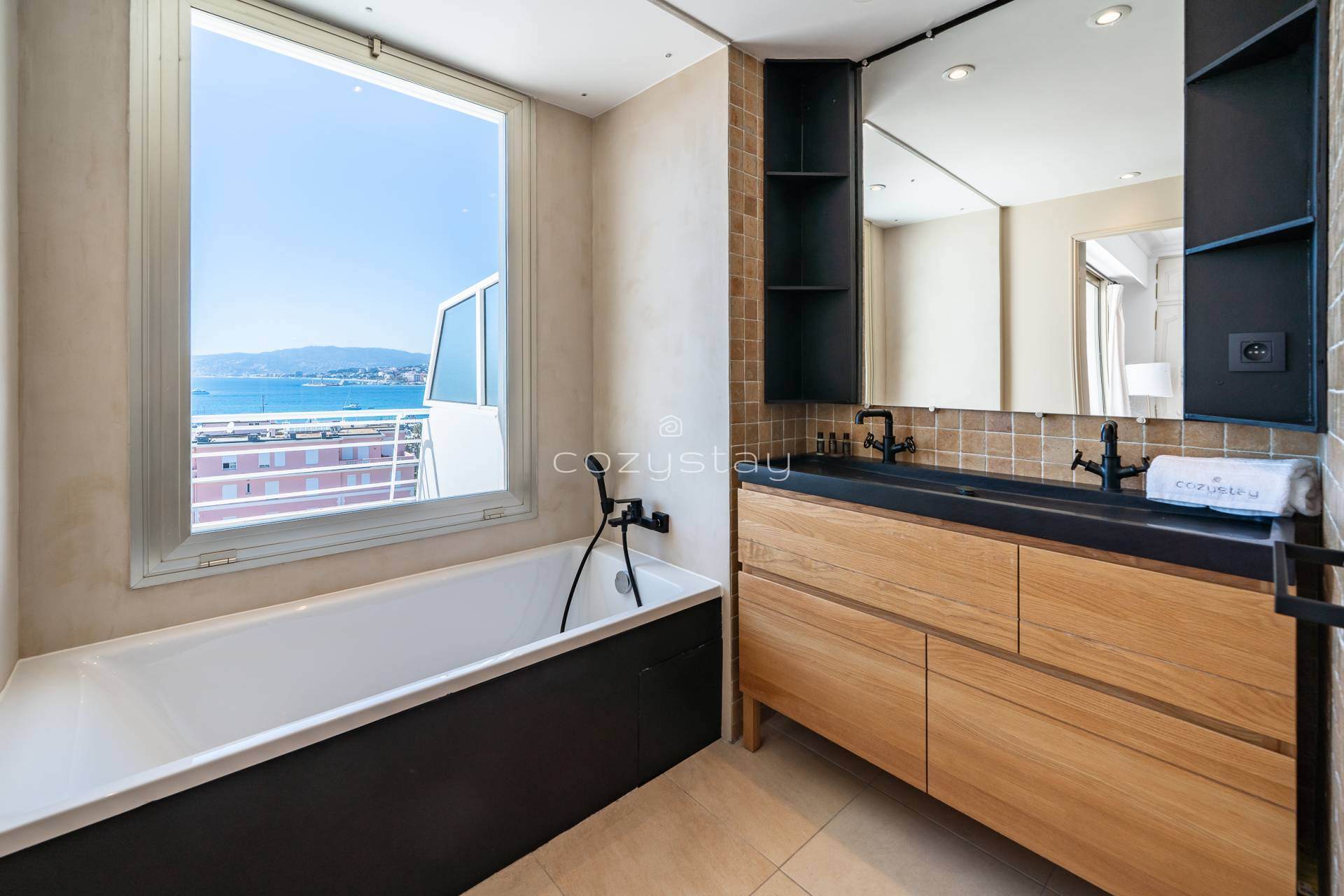 L’intérieur de l’appartement est élégant et moderne. La pièce maîtresse est un séjour lumineux avec de grandes baies vitrées qui offrent une vue panoramique imprenable sur la mer Méditerranée et les îles de Lérins. L’espace est spacieux, accueillant et idéal pour se détendre ou recevoir des invités. La cuisine, moderne et entièrement rénovée, est ouverte sur le séjour, créant un espace de vie harmonieux et convivial.