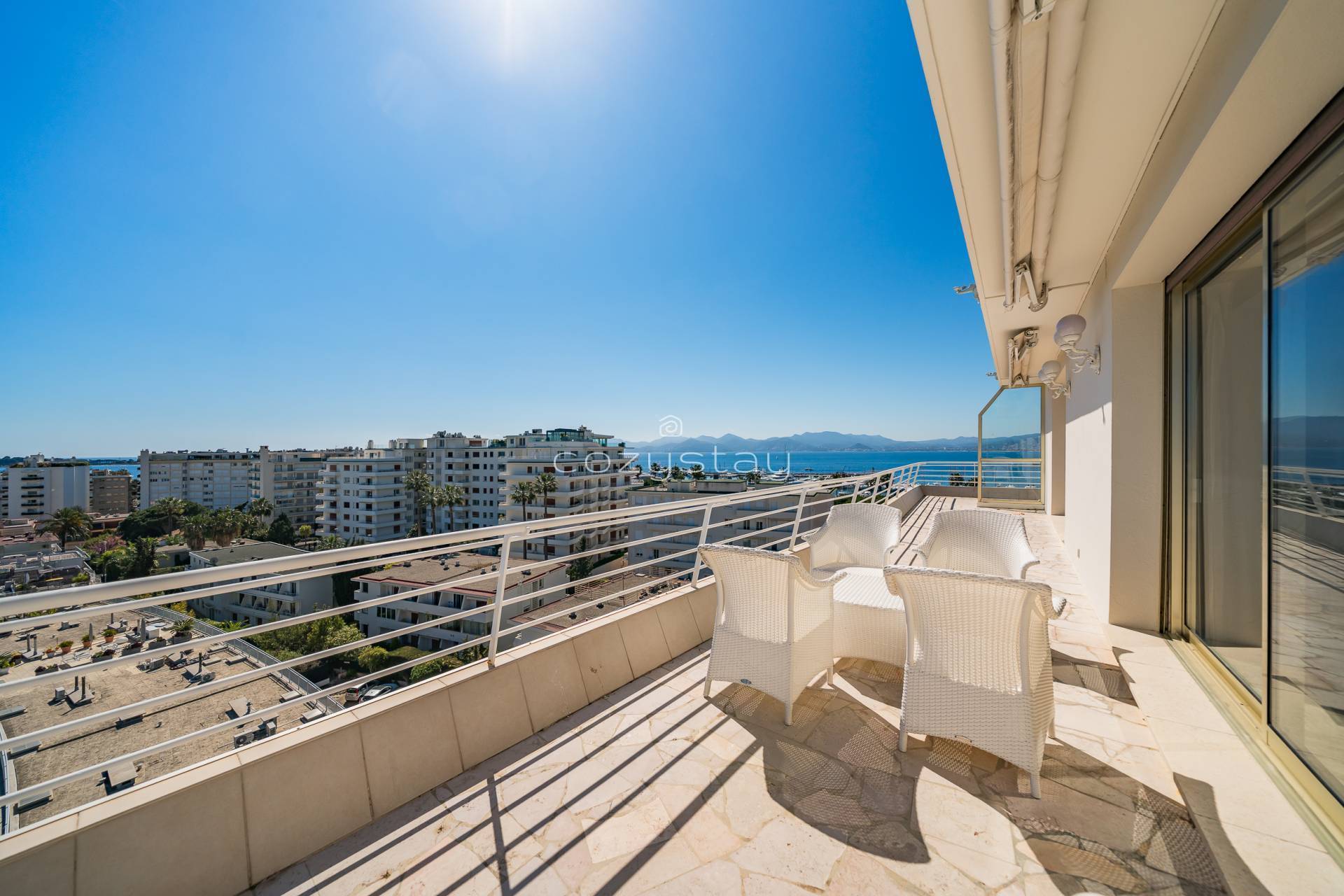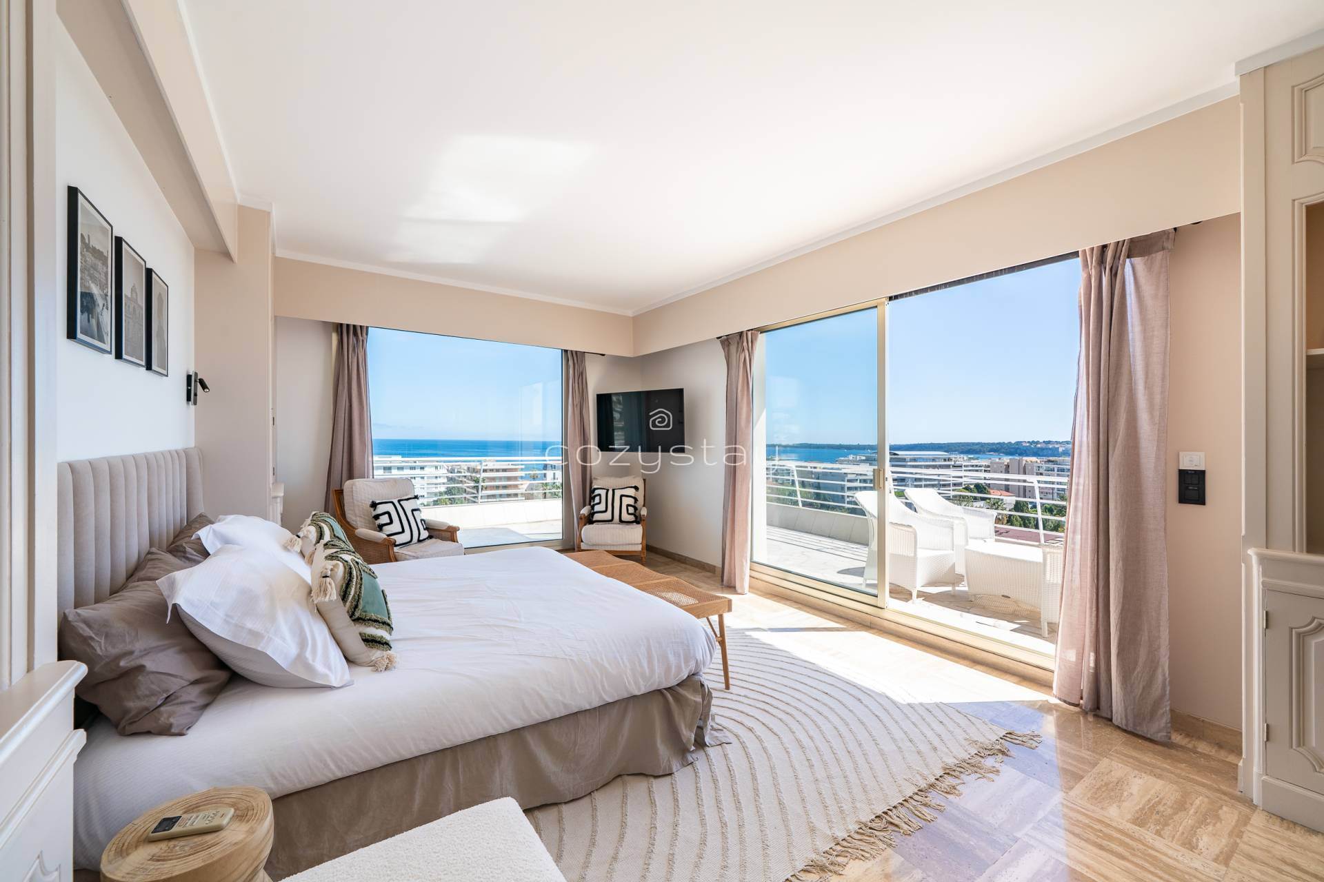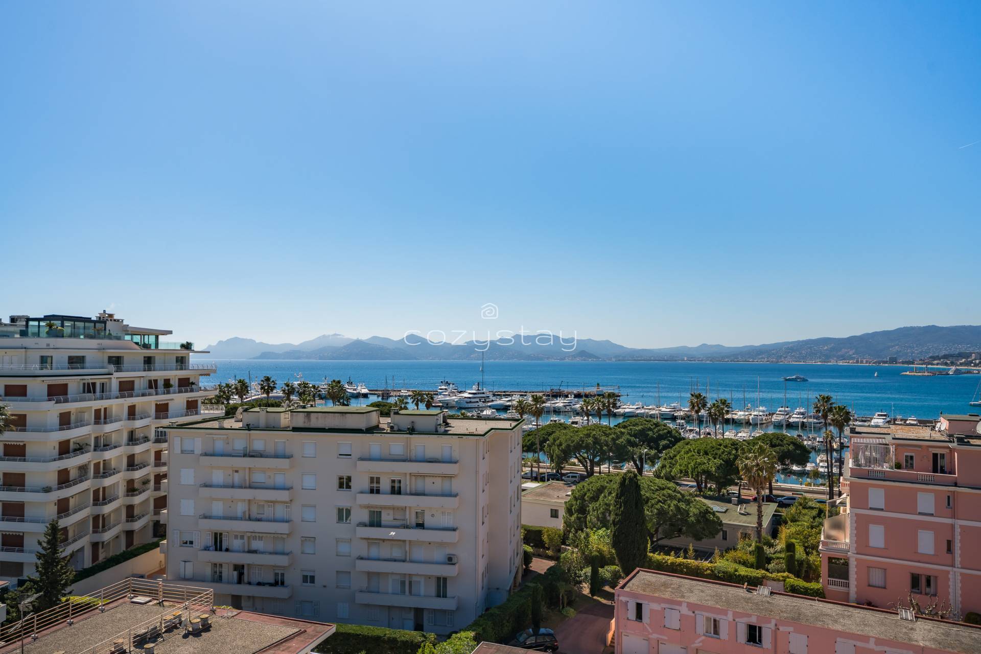Cet appartement de luxe, situé dans un immeuble en étage élevé près du centre de Cannes, est un véritable havre de paix offrant des vues spectaculaires. Idéalement situé, il est possible de rejoindre la Croisette en cinq minutes à pied et une quinzaine de minutes pour le Palais des Festivals.
