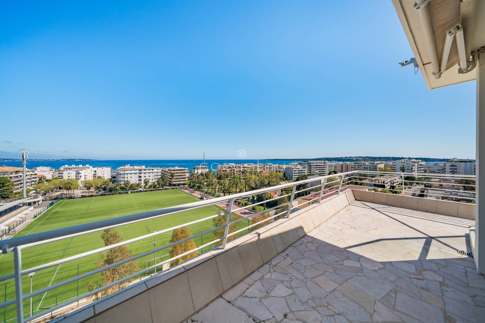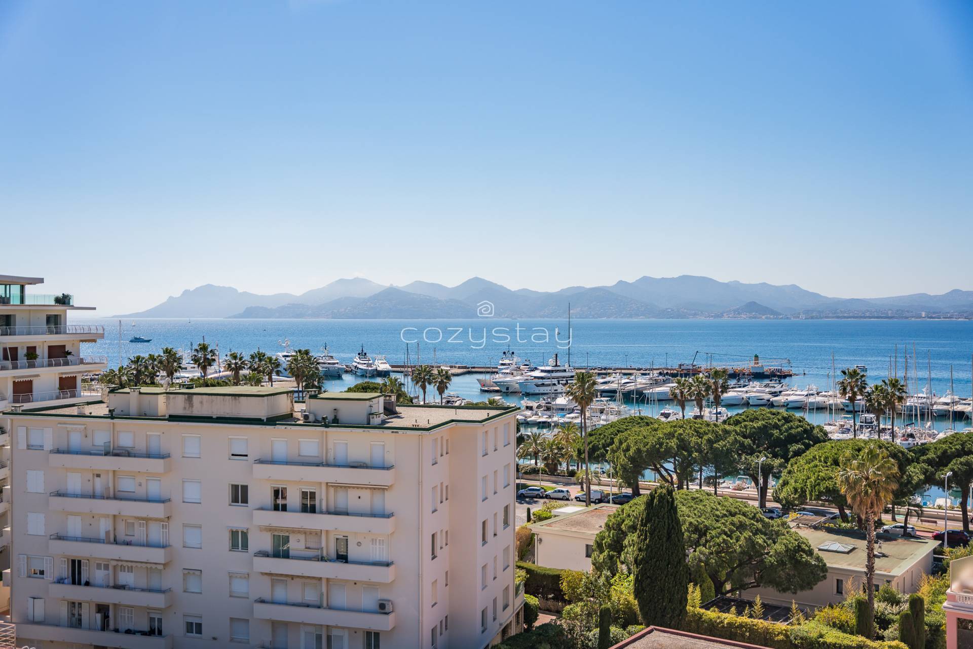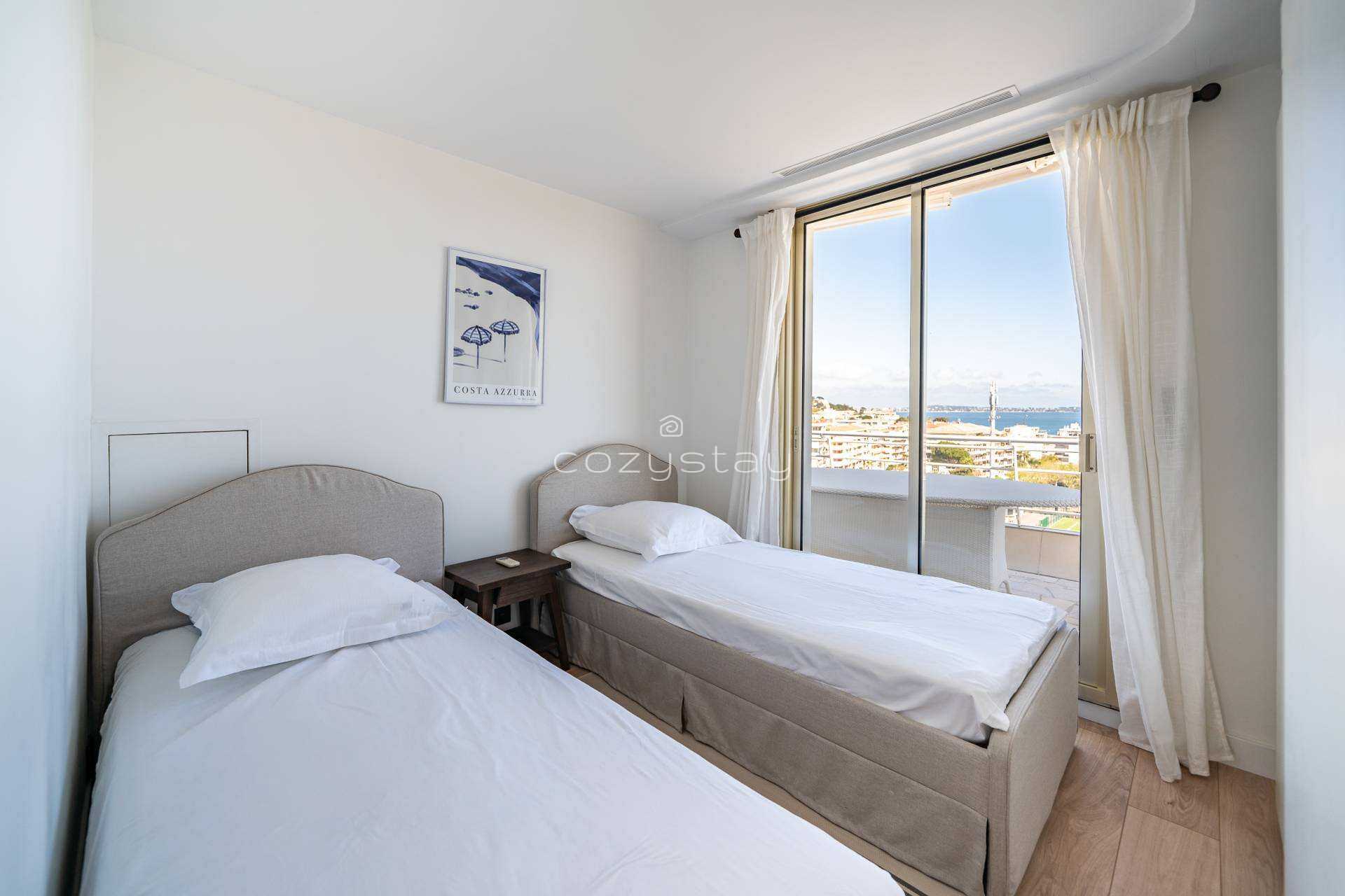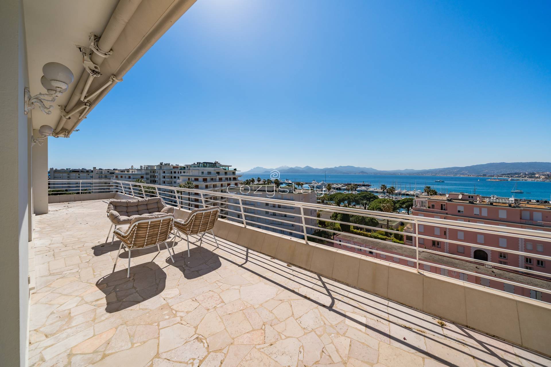 Cet appartement de luxe, situé dans un immeuble en étage élevé près du centre de Cannes, est un véritable havre de paix offrant des vues spectaculaires. Idéalement situé, il est possible de rejoindre la Croisette en cinq minutes à pied et une quinzaine de minutes pour le Palais des Festivals.